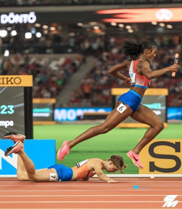 Justin Britton captured the dramatic final strides of the mixed-gender 4x400m final, where Femke Bol of the Netherlands appeared to have the gold medal in hand before a stumble in the final steps of the race changed everything. Team USA ended up taking the win in a world-record time of 3:08.80.