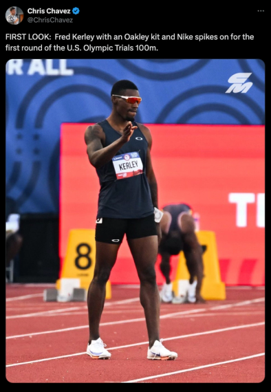 It was verrrrry interesting to see a black-clad Fred Kerley wearing Nike spikes and repping Oakley but no other major sponsor in the first round of the men’s 100m.