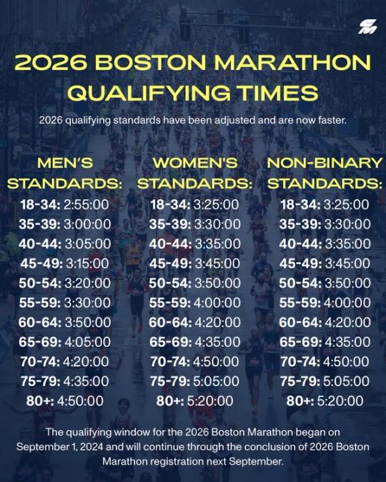 Beginning in the 2026 cycle (the qualifying window for which opened on September 1), runners aged 18-59 will have to target a time five minutes faster than the marks in place for the last six years. 60+ runners will have the same qualifying marks as before, but then again – they’re also getting BQs well into their senior years, so they deserve the break. The race will also have official non-binary qualifying marks for the first time.