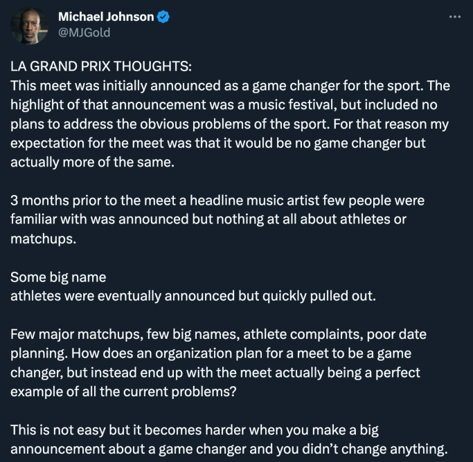 If the goal was to get track fans talking, then the USATF LA Grand Prix was certainly a success. Billed initially as “an athletics weekend unlike any other” and a “first-of-its-kind, star-studded event” that was “designed as a no-holds-barred, maximum celebration of the sport,” there was a lot of hype about what ultimately wound up being a regular track meet. (But give that copywriter a raise!)
