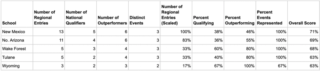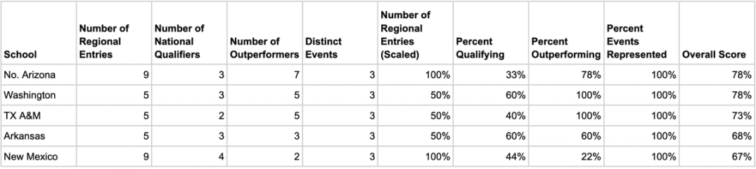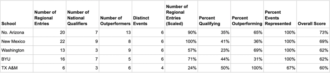 This weekend, athletes from around the country raced in regionals to punch their tickets to the 2025 NCAA Championships in Eugene, Oregon. Each year, two regional meets—East and West—host the top 48 qualifiers per event, with the top 12 finishers advancing to nationals. Though regionals is not a team-scored competition, I created a Distance Report Card to rank teams across four metrics related to performance at the regional meet. The Regionals Distance Report Card focuses on the three distance events: the 3k Steeplechase, the 5k, and the 10k. To make all values fall between 0 and 1, I applied min-max scaling to the number of entries criterion. For more information on min-max scaling, see this documentation from scikit-learn.