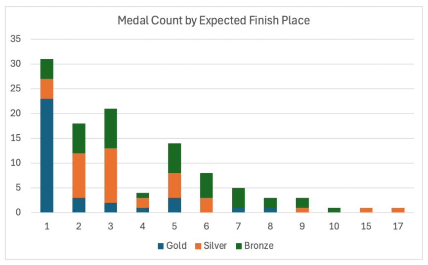 It’s fun to watch the top-ranked athletes win medals, but it can be even more thrilling when an athlete exceeds expectations to end up on the podium. The following graph shows the medal count by expected finish place.