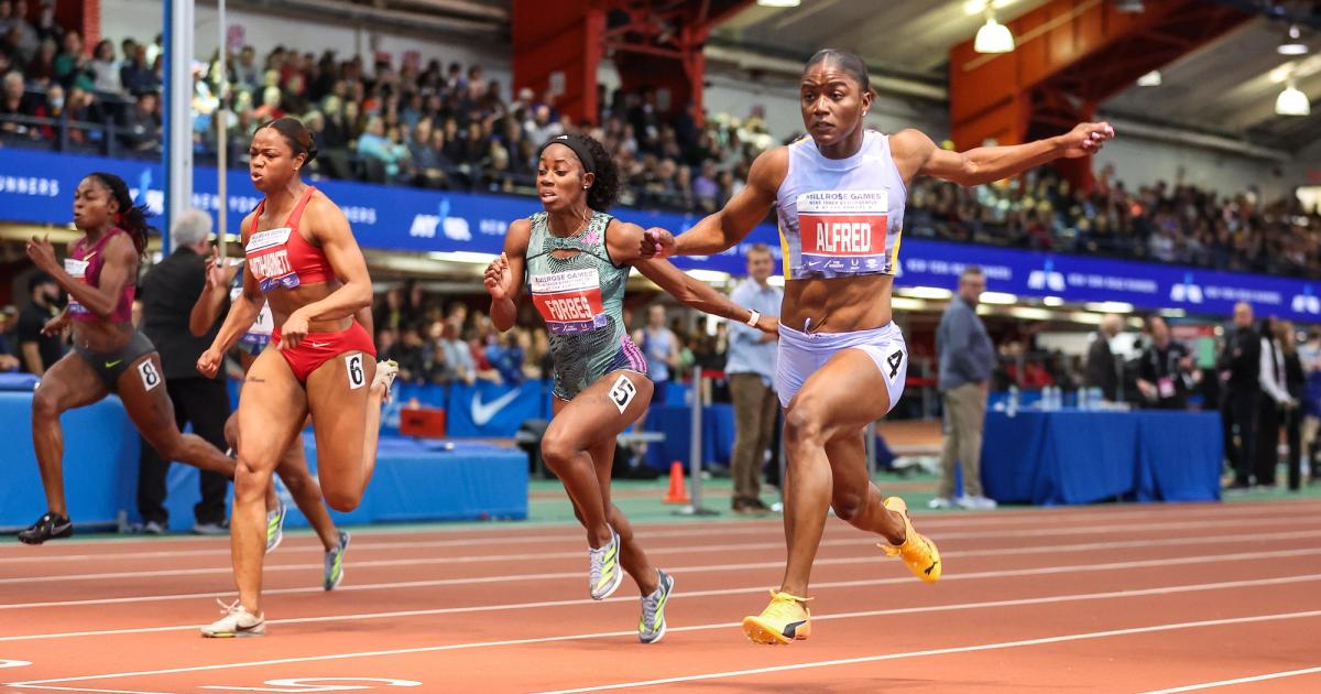 Julien Alfred wins the 60m at the 2024 Millrose Games in 6.99s.